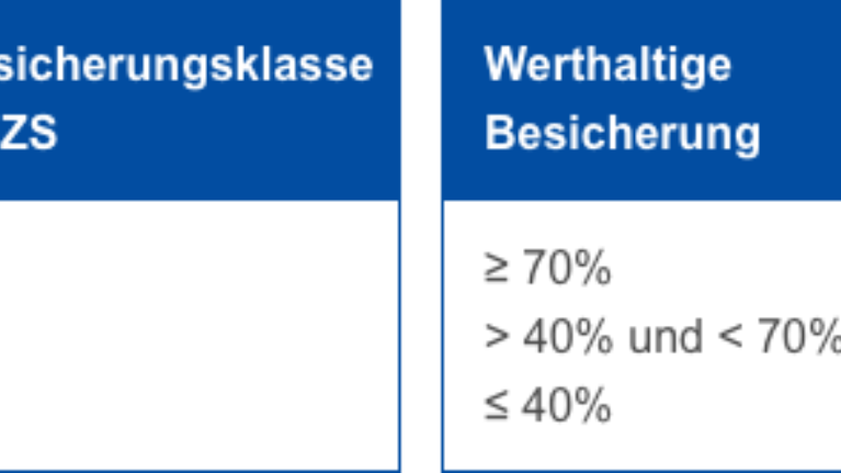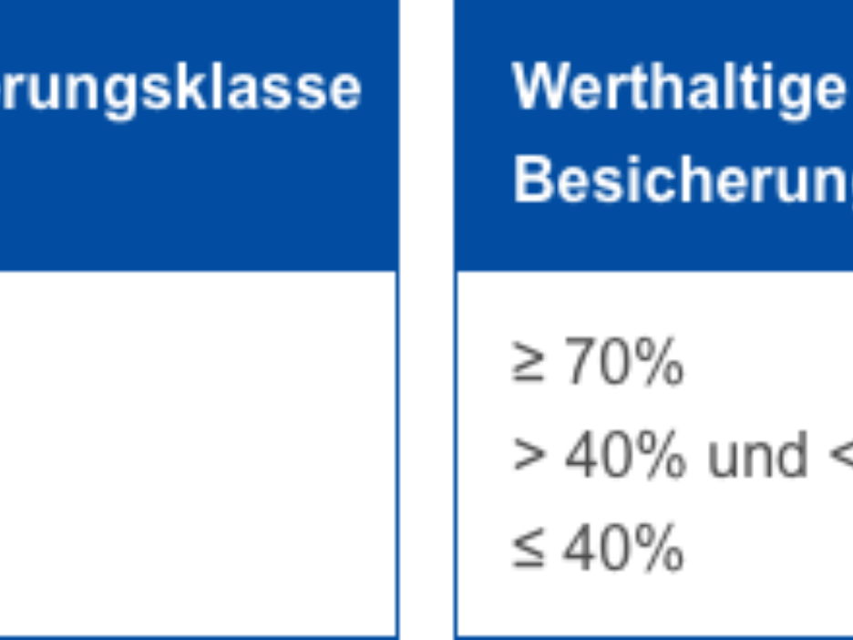 Im zweiten Schritt ermitteln die Hausbanken die Werthaltigkeit der Verwertung Ihrer Besicherung – diese entspricht dem Anteil des Darlehens, welcher im Falle einer (Rück-) Zahlungsunfähigkeit durch die Erlöse aus dem Verkauf Ihrer Sicherheiten voraussichtlich gedeckt werden kann.