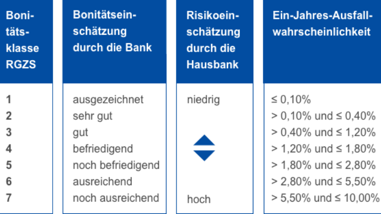 Ermittelt wird dabei ein Prozentwert, der wiedergibt, welche Wahrscheinlichkeit die Hausbank Ihrem Unternehmen beimisst, das Darlehen nicht zurückzahlen zu können. Ausgehend davon erfolgt die Zuordnung in die entsprechende Bonitätsklasse: