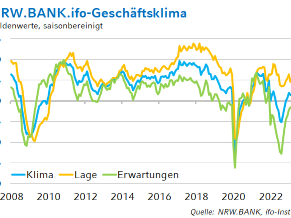 Das NRW.BANK.ifo-Geschäftsklima ist ein Frühindikator für die konjunkturelle Entwicklung in Nordrhein-Westfalen. Im Auftrag der NRW.BANK werden monatlich über 1.500 Unternehmen aus den Wirtschaftsbereichen Verarbeitendes Gewerbe, Bauhauptgewerbe, Großhandel, Einzelhandel sowie Dienstleistungen zu ihrer aktuellen wirtschaftlichen Situation sowie ihren Zukunftsaussichten befragt. Die Ergebnisse analysiert und veröffentlicht die NRW.BANK monatlich.