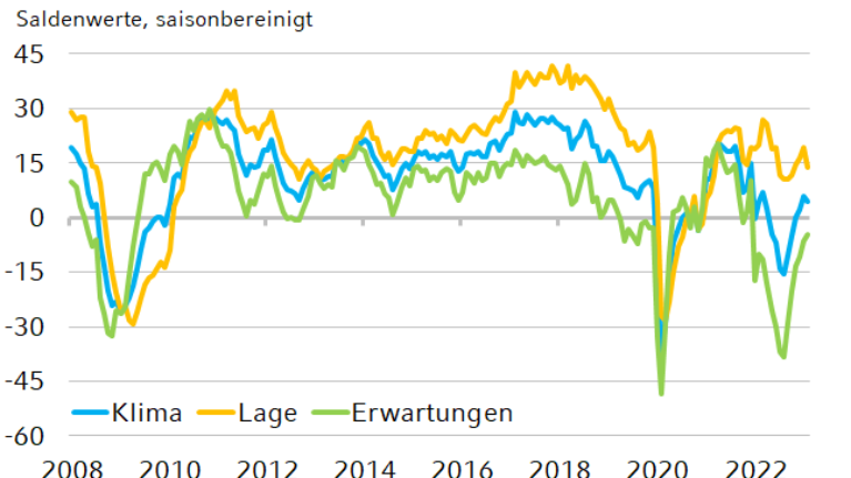 Auch im Verarbeitenden Gewerbe hat sich das Geschäftsklima eingetrübt. Insbesondere die aktuellen Geschäfte wurden weniger gut beurteilt. Bei den Geschäftsaussichten für die nächsten sechs Monate dominiert weiterhin eine pessimistische Stimmung. Die einzelnen Industriebranchen entwickelten sich dabei unterschiedlich. Im Maschinenbau und in der Metallerzeugung verschlechterte sich die Stimmung deutlich. Ein Plus gab es hingegen in der chemischen Industrie, die von gesunkenen Gaspreisen profitierte.