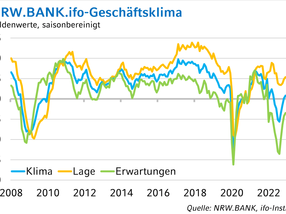 Das NRW.BANK.ifo-Geschäftsklima ist ein Frühindikator für die konjunkturelle Entwicklung in Nordrhein-Westfalen. Im Auftrag der NRW.BANK werden monatlich über 1.500 Unternehmen aus den Wirtschaftsbereichen Verarbeitendes Gewerbe, Bauhauptgewerbe, Großhandel, Einzelhandel sowie Dienstleistungen zu ihrer aktuellen wirtschaftlichen Situation sowie ihren Zukunftsaussichten befragt. Die Ergebnisse analysiert und veröffentlicht die NRW.BANK monatlich.