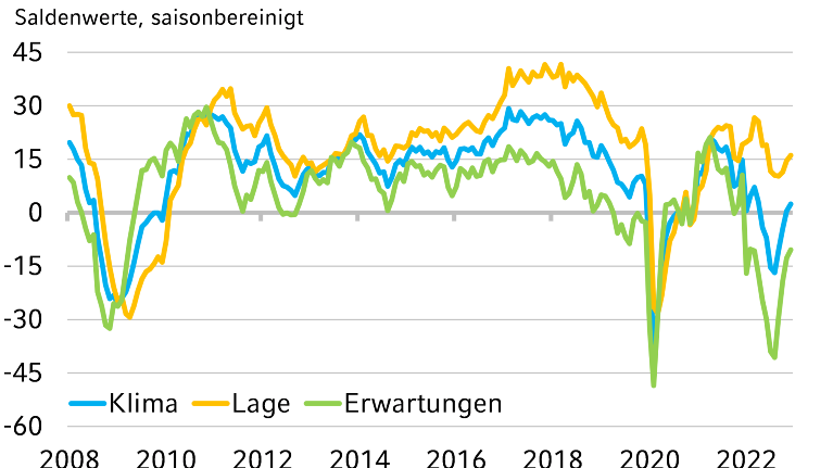 Als einzige Branche trübte sich die Stimmung im Verarbeitenden Gewerbe ein. Vor allem ihre gegenwärtigen Geschäfte beurteilten die Industrieunternehmen im Februar merklich schlechter als noch im Vormonat. Die Erwartungen an die nächsten sechs Monate hellten sich hingegen auf. Treiber der negativen Entwicklung des Geschäftsklimas in der Branche war vor allem die landesweit bedeutende chemische Industrie, in der die Beurteilung der aktuellen Geschäftslage um über 40 Saldenpunkte einbrach. Der Branche macht vor allem der erneut gesunkene Bestand an Aufträgen zu schaffen. Im Vergleich zum Vormonat sanken zudem erstmals seit Ende 2020 die Preise, was die Erlöse der Unternehmen schmälert. Noch stärker als in der chemischen Industrie fiel der Stimmungsrückgang in der Ernährungsindustrie aus, die im Februar ebenfalls weniger Neuaufträge verzeichnete.