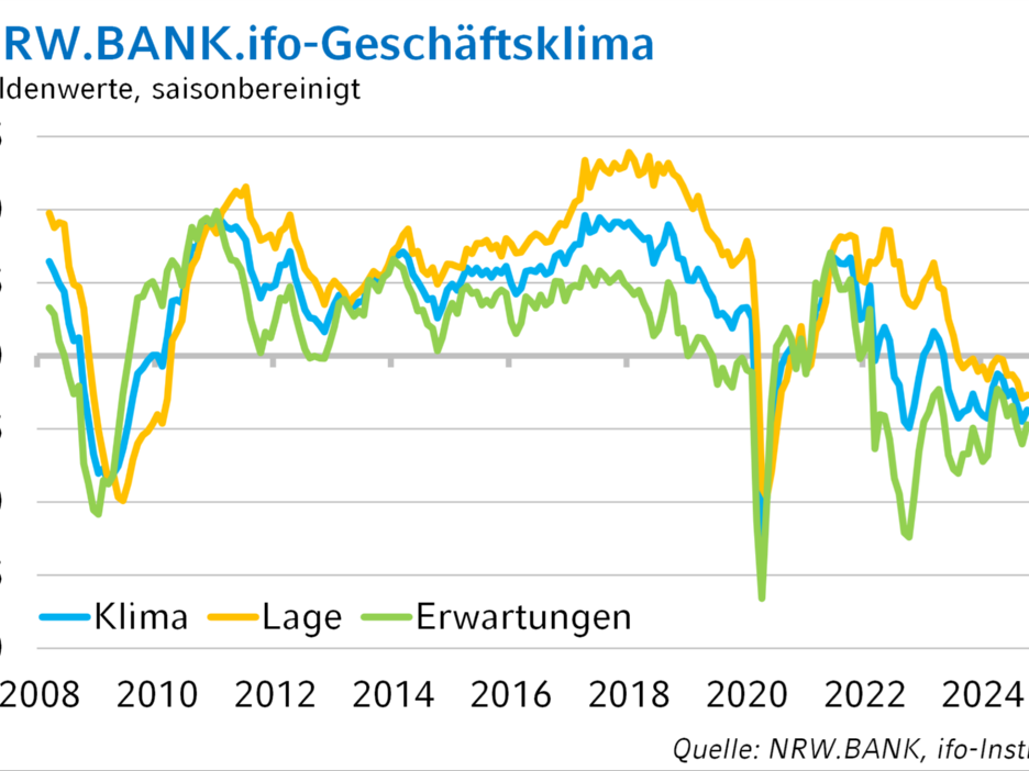 Das NRW.BANK.ifo-Geschäftsklima ist ein Frühindikator für die konjunkturelle Entwicklung in Nordrhein-Westfalen. Im Auftrag der NRW.BANK werden monatlich über 1.500 Unternehmen aus den Wirtschaftsbereichen Verarbeitendes Gewerbe, Bauhauptgewerbe, Großhandel, Einzelhandel sowie Dienstleistungen zu ihrer aktuellen wirtschaftlichen Situation sowie ihren Zukunftsaussichten befragt. Die Ergebnisse analysiert und veröffentlicht die NRW.BANK monatlich.