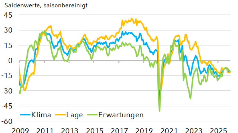 Auch im Handel sank das Geschäftsklima. Die Umfragewerte gingen um 2,6 auf -26,3 Punkte zurück. Die Urteile zur aktuellen Lage wurden nach unten korrigiert. Auch der Ausblick auf das erste Halbjahr 2026 trübte sich weiter ein. Vor allem die Einzelhändler zeigten sich unzufrieden mit dem Weihnachtsgeschäft.