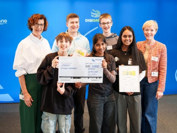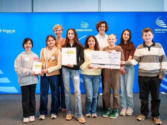 Gestern hat eine unabhängige Jury die drei besten Projekte des Schulwettbewerbs DIGIGREEN in der NRW.BANK in Düsseldorf ausgezeichnet. Zehn Gruppen aus ganz Nordrhein-Westfalen hatten sich bei dem landesweiten Wettbewerb für das Finale qualifiziert. Unter dem Motto „Digitale Ideen für eine grüne Zukunft“ hatten sie digital gestützte Lösungen für mehr Klimaschutz entwickelt. Die drei Gewinnerschulen kommen aus Bielefeld, Emsdetten und Lage. Der Wettbewerb steht unter Schirmherrschaft des Ministeriums für Schule und Bildung des Landes Nordrhein-Westfalen und wird von der DIE BILDUNGSGENOSSENSCHAFT – Beste Chancen für alle eG (bigeno) und der NRW.BANK durchgeführt.