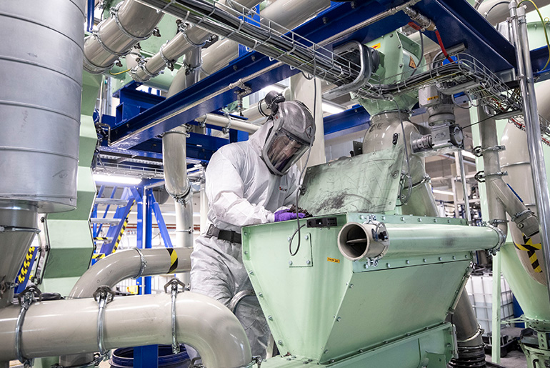Mehreren Jahren der Forschung folgte 2022 die Unternehmensgründung und knapp ein Jahr später die Inbetriebnahme einer Pilotanlage im Technopark Aachen. Das tägliche Recyclingvolumen: 500 Kilogramm. „Die Pilotlinie nutzen wir dafür, um Prozesse zu qualifizieren und langfristige Kundenbeziehungen zu entwickeln – beispielsweise zu Automobil- und Batterieherstellern“, sagt Gideon Schwich.
