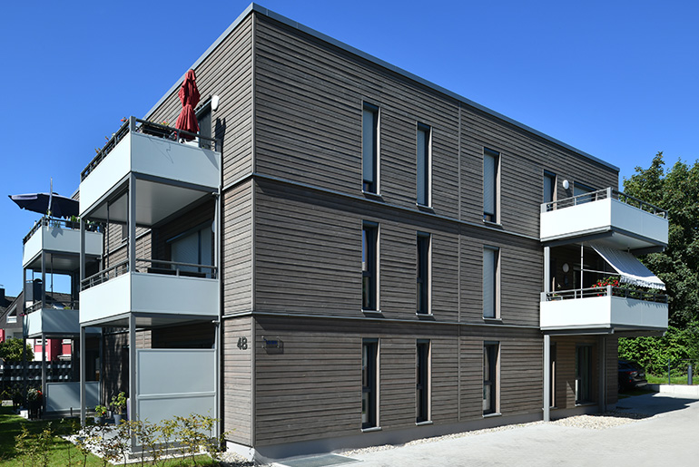 Das Gebäude wurde in einer nachhaltigen Holz-Hybrid-Bauweise errichtet, bei der vorgefertigte Holzelemente um einen massiven Betonkern verbaut wurden. Diese Konstruktion verbindet die Tragfähigkeit von Beton mit den ökologischen Eigenschaften von Holz und dient als stabile Basis für Fundamente, Treppenhäuser, Aufzüge und Deckenkonstruktionen. Der Baustoff Holz spielt eine zentrale Rolle: Als nachwachsender und vollständig recyclingfähiger Rohstoff verbessert er die Ökobilanz des Hauses. Darüber hinaus reguliert er durch seine thermischen Eigenschaften auf natürliche Weise die Luftfeuchtigkeit und trägt dank seiner Dämmeigenschaften zu einer angenehmen Raumtemperatur bei.