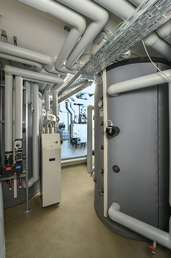 Das Wohnhaus kommt komplett ohne fossile Brennstoffe aus. Eine zentrale Heizungsanlage sorgt für eine effiziente Wärmeversorgung: Die Grundwärme und die Erwärmung des Frischwassers werden durch eine Luftwärmepumpe erzeugt, bei Spitzenlasten liefert eine Sole-Wärmepumpe zusätzliche Energie. Ergänzt wird das System durch Solarthermie, was den Verzicht auf fossile Energieträger ermöglicht und den CO₂-Ausstoß erheblich reduziert.