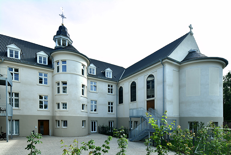 Das ehemalige Kloster vereint heute vielfältige Nutzungen unter einem Dach: Neben den 17 barrierefreien, öffentlich geförderten Wohnungen für Ein- bis Zweipersonenhaushalte gibt es eine ebenfalls öffentlich geförderte Gemeinschaftswohnung für acht Menschen mit besonderem Betreuungsbedarf. Bei der Umsetzung stellte die denkmalgeschützte Fassade das Projektteam allerdings vor große Herausforderungen. Geförderte Wohnungen benötigen Freisitze wie Balkone, Terrassen oder Loggien, doch die strengen Auflagen des Denkmalschutzes ließen kaum bauliche Veränderungen zu. Die Lösung fand sich in der kreativen Zusammenarbeit aller Beteiligten: Leichte Vorstellbalkone wurden angebracht, die den historischen Charakter des Gebäudes bewahren und gleichzeitig zeitgemäßen Wohnkomfort bieten.